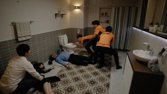 Quite baffled and disturbed, Bong-soo naturally makes an emergency call. He is subsequently told that a paramedic team will soon come to his apartment, but, of course, things quickly get weirder for Bong-soo and his wife. They are relieved to see the security guy of their apartment building coming to their apartment, but something scary happens to the security guy right before the paramedic team eventually arrives, and, what do you know, they and several others find themselves somehow locked inside the bathroom.
