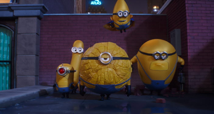 And there are, yes, the Minions, who all are voiced by Pierre Coffin, the co-director of “Despicable Me” and its two following sequels. I found them rather tiresome as they became more and more ubiquitous during last 14 years, but they are still fairly amusing as they get themselves involved into one ridiculous slapstick moment after another. Here in this film, they become the official assets of AVL due to Gru and his family’s temporary absence, and the five selected ones are subjected to a top-secret experiment which turns them into superheroes, though that does not improve their intelligence that much as shown from one funny sequence where they attempt to do some public service.