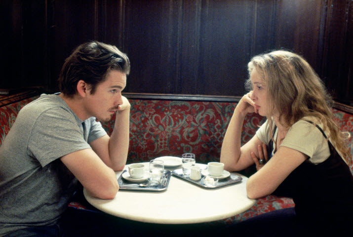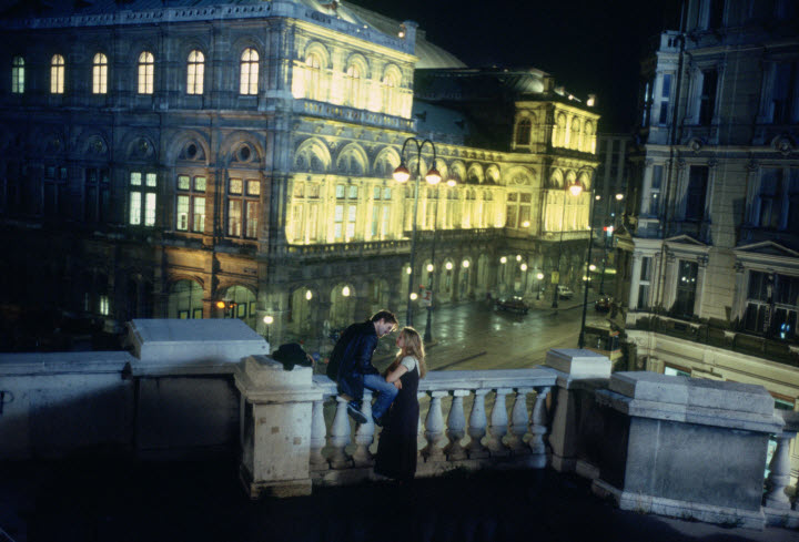 They are Céline (Julie Delpy) and Jesse (Ethan Hawke), and they soon find themselves talking a lot with each other in English once Jesse clumsily attempts to approach to Céline. Despite being total strangers to each other, they enjoy each other’s company nonetheless as sensing more of the mutual attraction between them, and Jesse eventually suggests that Céline should stay along with him in Vienna for one night before he takes a plane to US in the next morning. While initially hesitating a bit, Céline agrees to do that, and she and Jesse begin to wander freely around here and there as time casually passes by in Vienna.