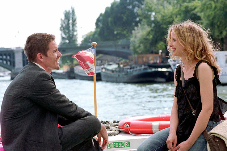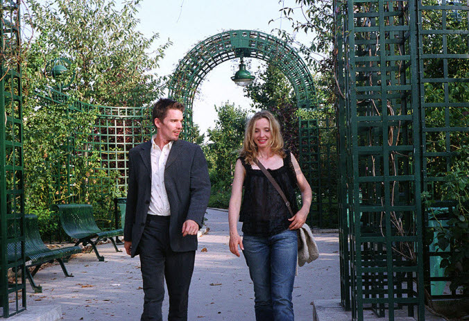 The movie begins with one of its two main characters going through the last part of his book tour in Paris during one sunny afternoon. After several years have passed since what happened between him and Céline (Julie Delpy) in “Before Sunrise” (1985), Jesse (Ethan Hawke) becomes a successful writer, and he recently published a book which is clearly based on his romantic experience with her during that time in Vienna. At a meeting being held at a certain famous old bookstore, he is asked about how much his novel is actually close to his real-life romance, but he only responds with vague answers, even while his mind cannot help but go back to that lovely time with Céline.