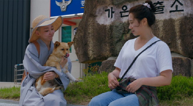 Anyway, Moon-gyeong goes down to Moongyeong, and then we are introduced to a young female monk named Ga-eun (Cho Jae-kyeong), who happens to be ready to go her own way right after finishing her novice period in a big temple near to Moongyeong. She and Moon-kyeong come across each other via a little accident involved with one cute stray dog, and they soon find themselves going around here and there in the town for locating the owner of that injured stray dog. Yes, they can simply take it to a nearby animal shelter after going to a local veterinarian, but the local veterinarian tells them that it will likely get euthanized several days later, and that is certainly the last thing they want. After all, they already named it “Gil-soon”, and the dog already becomes quite friendly to them.