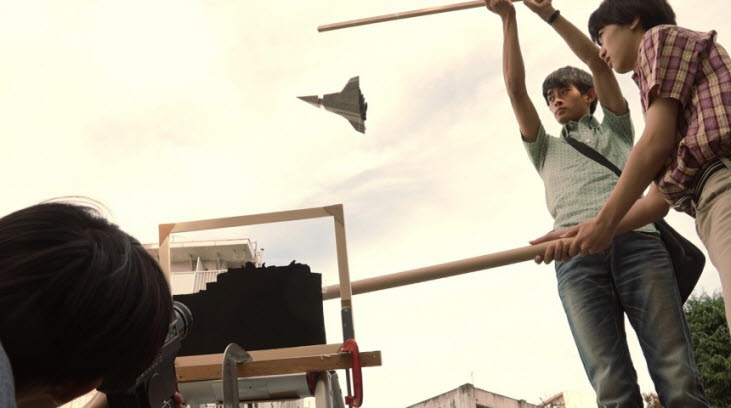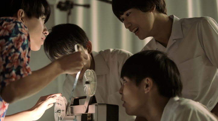 However, Natsumi eventually changes her mind at the last minute to the delight of Hiroshi and his friends, and they all try their best during the following shooting period. There naturally come a number of small and big technical challenges, but Hiroshi and his friends always find a solution in one inventive way or another to our little amusement, and they become all the more spirited as getting assisted by several classmates of theirs, who are also quite excited about being behind and in front of the camera.