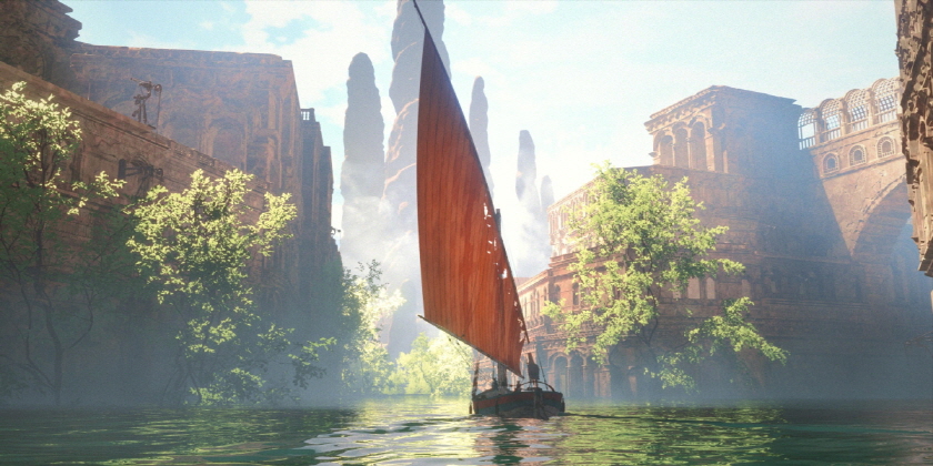 The story gets a little more interesting when the cat and its animal companions later encounter a bunch of big secretary bird. After one of these big birds happens to join the cat and its animal companions, they eventually reach to a huge but empty city partially immersed in water, and the film naturally gives us several moments of awe and wonder as its animal characters regard here and there in the city. Wondering what they exactly feel and think about the city as their boat keeps sailing as before, I was again reminded of what W.G. Sebald once said: “Men and animals regard each other across a gulf of mutual incomprehension.”