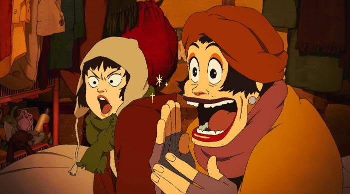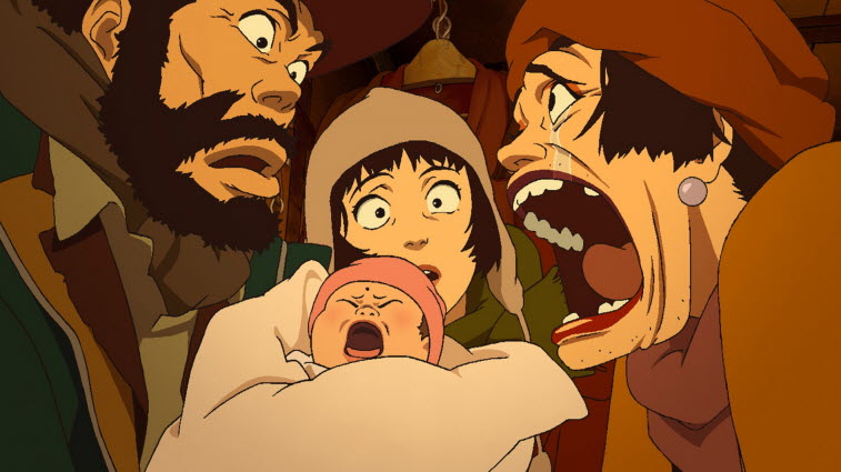 As these three main figures go through their little bumpy journey along with the baby, the screenplay by Kon and his co-writer Keiko Nobumoto deftly balances itself between comedy and melodrama. While the unpleasant odor of its three homeless characters often functions as a sort or running gag, the story gradually brings some depth and pathos to each of them as they come to reveal more of their past and humanity, and we come to care about them as well as the baby, who fortunately does not seem to be aware that much of what is going on even in the end.