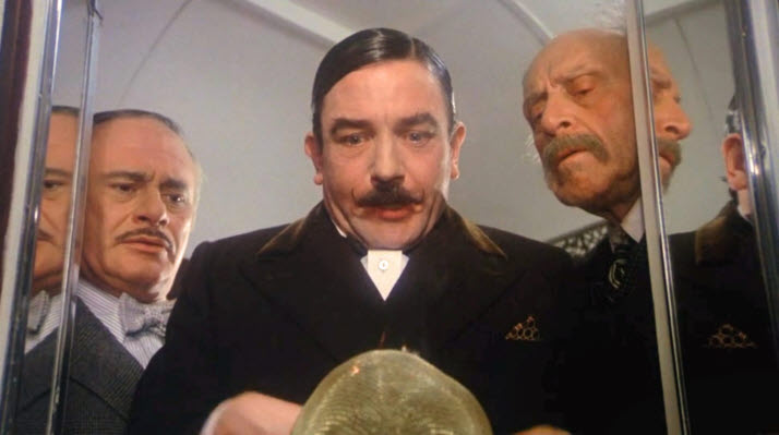 Above all, Lumet allows his performers to bring some extra personality to their broad archetype roles in addition to having each own moment along the story, and their game efforts are firmly anchored by the masterful comic performance by Albert Finney, who got deservedly Oscar-nominated for this film. While quite amusing in many of his deliberately mannered touches to savor, Finney gradually takes the center as the plot thickens as expected, and he eventually dominates over all of his other fellow cast members when his character has to deliver a rather long explanation on what really happened at that time (Critic Roger Ebert wrote in his 1974 review: “…it’s fun of a rather malicious sort watching a dozen high-priced stars keep their mouths shut and just listen while Finney masterfully dominates the scene.”).