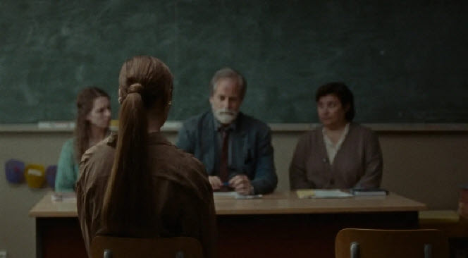 While these and a few other main characters including Sunna pull and push each other, the movie steadily builds up tension across the screen with the frequent close-ups during its several key scenes, and then it enters the realm of warped psychodrama after Elizabeth’s defiant facade eventually crumbles with hysterical laughter at one point in the middle of the story. Getting cornered by Sarah and the school principal in one way or another, she keeps getting exasperated and frustrated, and her state of mind becomes more unreliable as she wanders around the empty corridors of the school alone by herself. If the first half of the film is as tense and sobering as those Bergman chamber drama film, the second half of the film is often reminiscent of several notable Polanski films such as “Repulsion” (1965), and we are not so surprised when Elizabeth comes to lose herself more among hallucinatory figures.