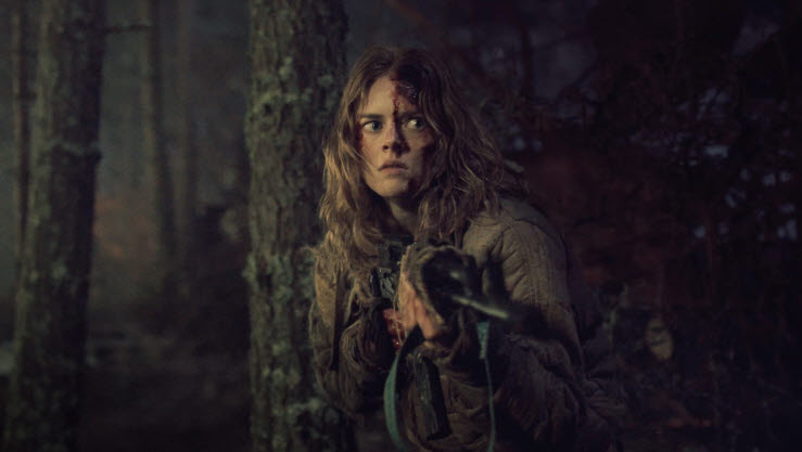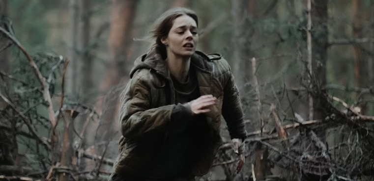 As she tries to get away from not only the cult members but also those horrible entities in the forest, the movie shows more of how the cult members have stuck together under their female leader, who is played by Danish actress Vic Carmen Sonne (She was utterly unforgettable in Oscar-nominated film “The Girl with the Needle” (2024), by the way). While having incidentally been pregnant for several months at least, the leader seems to exert considerable influence over her followers, and there is a creepy moment when she and her followers silently pray together over the little but disturbing sound of a wind coming into their derelict church.