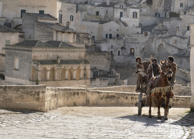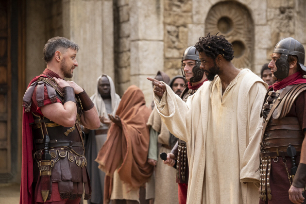 After several attempts and failures, Clarence comes upon a seemingly good idea. Watching how a certain well-known figure and his 12 apostles including his own twin brother exert considerable influence on the people of Jerusalem, Clarence decides to be another apostle of his, and we get a little amusing moment when he approaches to those 12 apostles for proving himself. After seeing that they do not regard him that seriously, he chooses to do his own religion business instead, and Elijah willingly joins his business scheme along with Barabbas (Omar Sy), a hulking gladiator Clarence managed to liberate at one point.