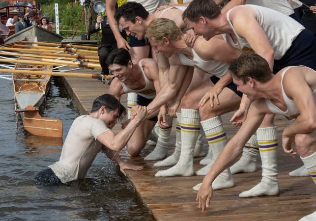 It is not much of a spoiler to tell you that Ulbrickson and his boys come to distinguish themselves more as the surprising underdog team of that year. However, Mark L. Smith’s screenplay, which is based on the nonfiction book of the same name by Daniel James Brown, simply sails on their athletic advance without much development in terms of story and character, and that is the main disappointment in the film. While Rantz and many other main characters including Ulbrickson are more or less then broad archetypes, the movie does not delve that much into the human aspects of Rantz and several other colleagues, and a romantic subplot involved with Rantz’ girlfriend is redundant at best and superficial at worst.