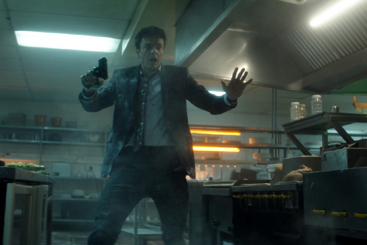 And the movie continues to serve us with more action scenes, which will make you wince at times for good reasons. During the action scene involved with a hulking neo-Nazi tattooist, Caine willingly uses some pieces of shattered glass for fighting against this big dude, and you will be alternatively amused and horrified by how he does that. In case of another action sequence unfolded inside a certain shabby place full of booby traps, we get a hilarious moment when Caine must feign to feel pain just for holding one of the bank robbers longer for his possible survival.