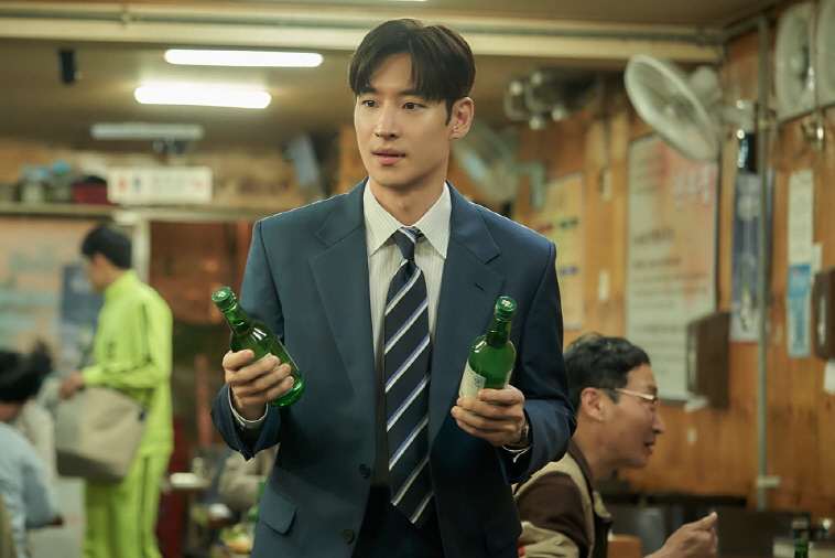Under his boss’ order, Jong-rok is surely ready to be friendly and cooperative to In-beom as much as possible, and that leads to a series of lightweight moments involved with a lot of drinking between them. While they have one drinking night after another with many bottles of soju manufactured by Gukbo Group, Jong-rok willingly lets In-beom and Solqueen look more into the current financial status of Gukbo Group, and it looks like the promising beginning of the productive partnership between the company and Solqueen.
