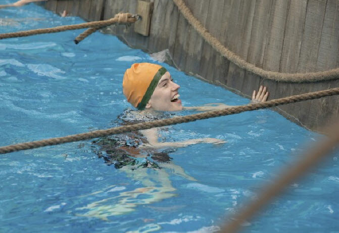 Anyway, Ederle and several other members of the US women’s team are supervised by a German trainer named Jabez Wolffe (Christopher Eccleston) during their trip to the 1924 Paris Olympics, and we see how much they are disregarded and discriminated by their mean trainer. While those American male athletes are allowed to do routine training on the ship everyday, Ederle and the other American female athletes are not allowed to do that in contrast, and Wolffe does not pay much attention to their training or welfare while more concerned about his seasickness.