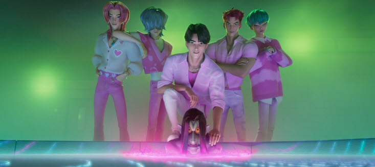 Of course, the master of those demons in the underworld is not so amused about this impending prospect, and one of those demons comes with a special plan for not only thwarting their opponents but also getting much more human souls than before. That demon in question is a former human singer named Jinu (voiced by Ahn Hyo-seop), and he is going to introduce himself and four other singings demons as, surprise, a new hot male K-Pop group to compete against their opponents.