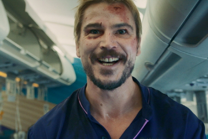 In short, this is sort of a cross between “Bullet Train” (2022) and those John Wick movies on airplane, and director James Madigan, who has been mainly known for his special effects technician career before making a feature film debut here (He won an Emmy for HBO TV series “Rome”, by the way), adds some absurd touches to this preposterous circumstance along the story. For example, there is a humorous moment involved with someone who happens to be sitting right next to Reyes, and we get extra laugh from how this moment leads to another twist in the story.