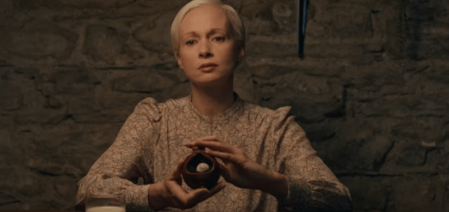 It goes without saying that the movie becomes creepier with more dread and tension during the last act, which expectedly reveals what Darcy is actually planning to do behind her back. While there surely come a few expected moments of shock and awe, the movie sticks to its slow but steady narrative pacing as before, and director/writer Damian McCarthy and his crew members including Cinematographer Colm Hogan did a good job of filling the screen with enough interest to engage us. As the camera usually sticks to static positions, we come to pay more attention to background details, and we become more aware of whatever is hovering around its heroine and a few other main characters in the story. In addition, Bracken’s solid dual performance ably holds the emotional center of the movie, and she is also supported well by several effective supporting performers including Gwilym Lee and Caroline Menton.