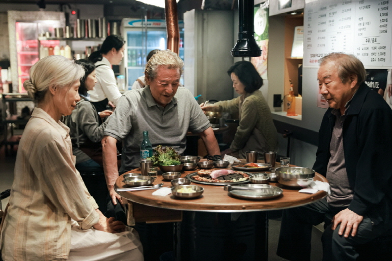 However, they are still reminded of how things are usually sad and depressing for them and many other old people around their age. At one point, Hyeong-joon goes to an old friend of his after receiving a call from him, and it soon turns out that this friend of his, who has also lived alone by himself just like Hyeong-joon, is preparing to die after feeling so miserable and frustrated with his declining life condition. At the following funeral of this poor old dude, Hyeong-joon and his two friends come to reflect more on how things have been hard and difficult for them mainly due to their ongoing aging, and the movie later becomes quite sentimental as they come to talk more about their respective pasts in the middle of their latest criminal dinner.