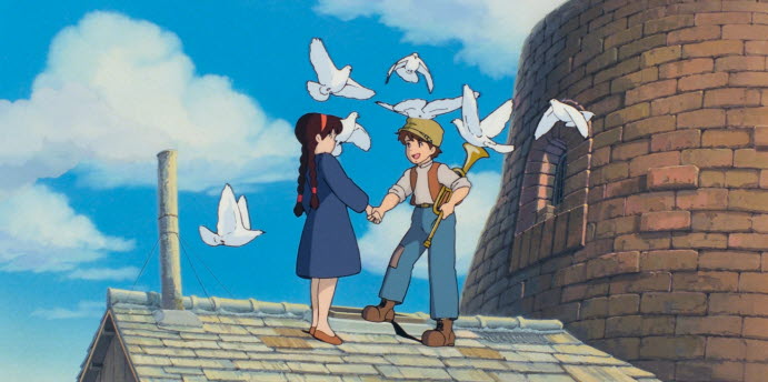 The film, which is mainly set in what can be regarded as a fantasy version of European country around the early 20th century, opens with a thrilling action scene in which a little orphan girl named Shita (voiced by Keiko Yokozawa) escapes from shady government agents when their airship is suddenly attacked by the pirates led by an old lady named Dola (voiced by Kotoe Hatsui). Thanks to a mysterious stone in her possession, Shita manages to survive even though she falls from the sky, but she becomes unconscious, and then her unconscious body happens to fall right in front of Pazu (voiced by Mayumi Tanaka), a young orphan boy working in a shabby mining village.